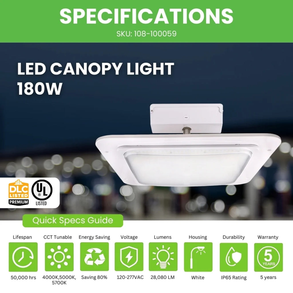 The wide 110-degree viewing angle ensures comprehensive coverage, making it an ideal choice for various applications. Built to withstand all weather conditions, our LED Canopy Light is IP65 rated for waterproof performance.It is UL, cUL, and DLC 5.1 Premium certified (also meets DLC 6.0 requirements), ensuring the highest standards of safety and quality. Also, it comes with 5 Year Warranty.