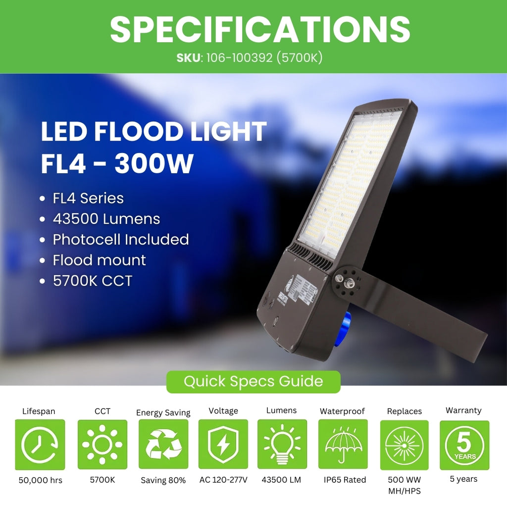 This LED flood light design comes with an adjustable flood mount that is easy to install and operate. The die cast aluminum housing is brown/bronze with a weatherproof IP65 rated. The light output distribution is an ideal Type III, designed with a dusk to dawn photocell sell and 1-10V dimming option to provide full customization. Additionally, the lights are DLC certified with a 5 year warranty.