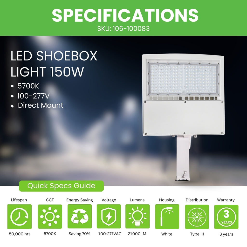 IP65 Wet Rated: Our Shoebox light is IP65 rated which makes it weatherproof and waterproof for outdoor applications.