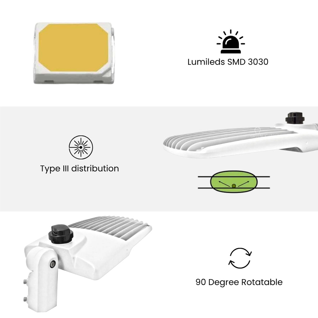 Our LED Street Light AL5 provides a powerful 300W output and a dazzling 40,500 lumens, this fixture throws brilliant illumination over wide areas, making it ideal for streets, parking lots, walkways, and more. It provides daylight-like clarity with 135LM/W that replaces traditional 1000W metal halide fixtures and saving upto 70% energy consumption. It has UL and DLC certifications for product safety, quality assurance and rebates.