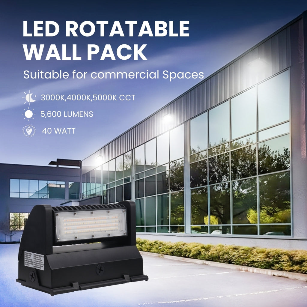 The Rotatable LED Wall Pack Lights are an excellent replacement for traditional outdoor security lights. This 40W LED Wall Pack emits impressive brightness ranging from 5000 LM - 5600 LM with the efficacy of up to 140 lm/w, replacing the 150W HID fixtures. This model is also available in 80W with 3 CCT Tunable options.