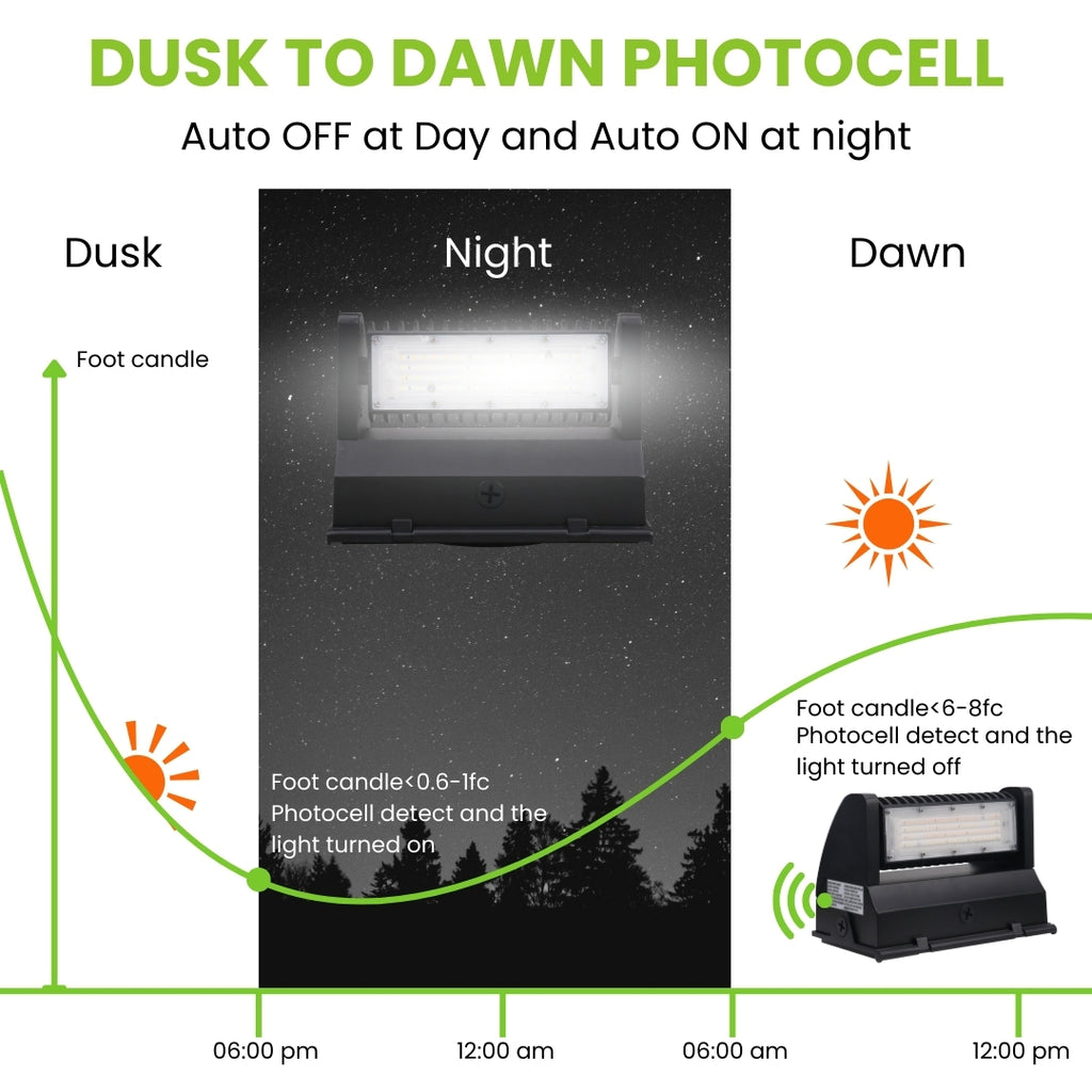- DC Photocell - The built-in DC Photocell is for automatic Dusk-to-Dawn lighting functionality. The DC photocell sensor detects the ambient light to turn on the light at dusk and turn it back off at dawn for energy saving.